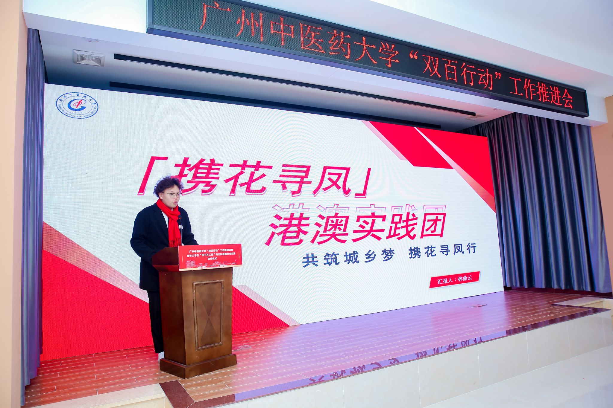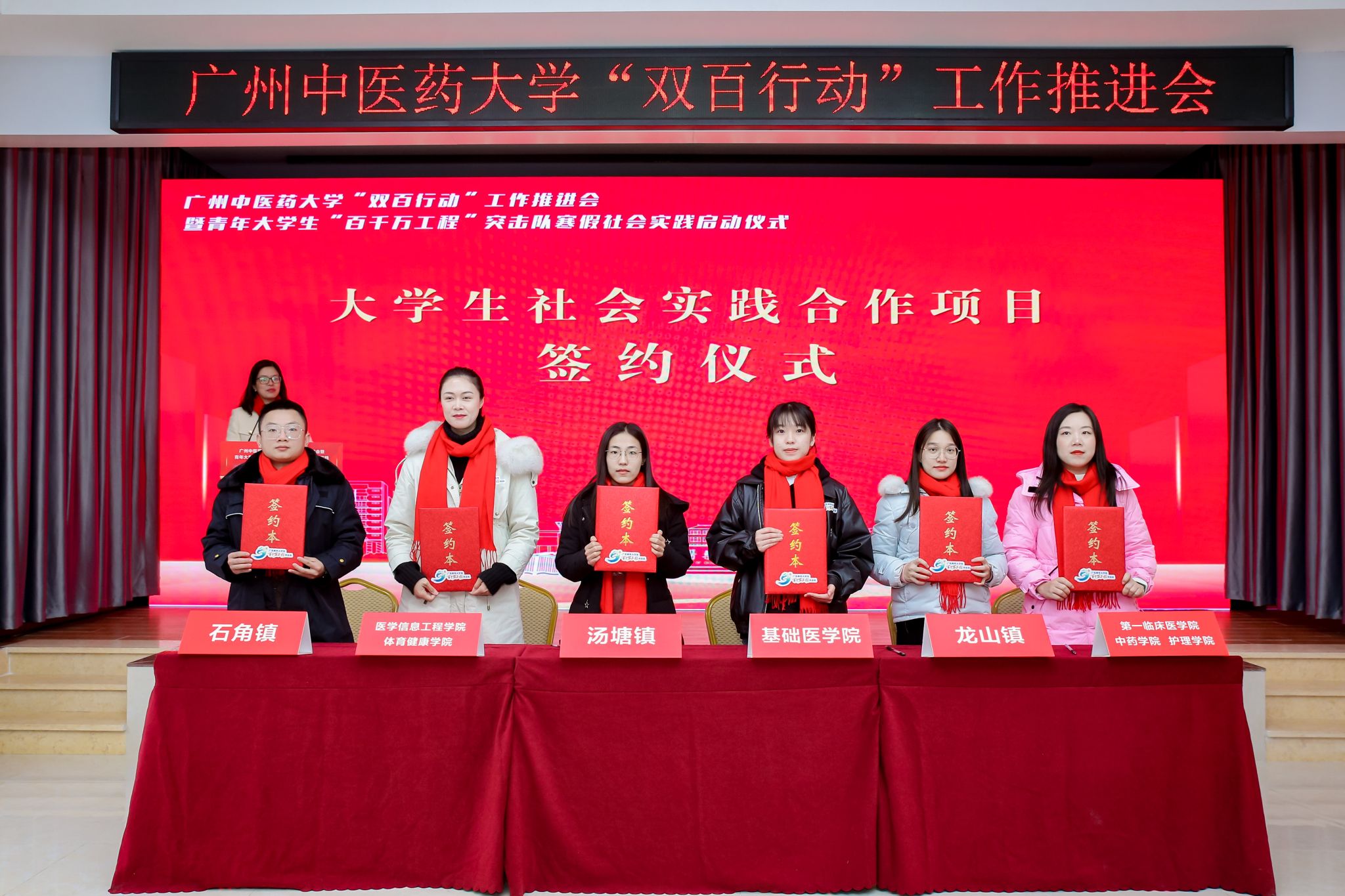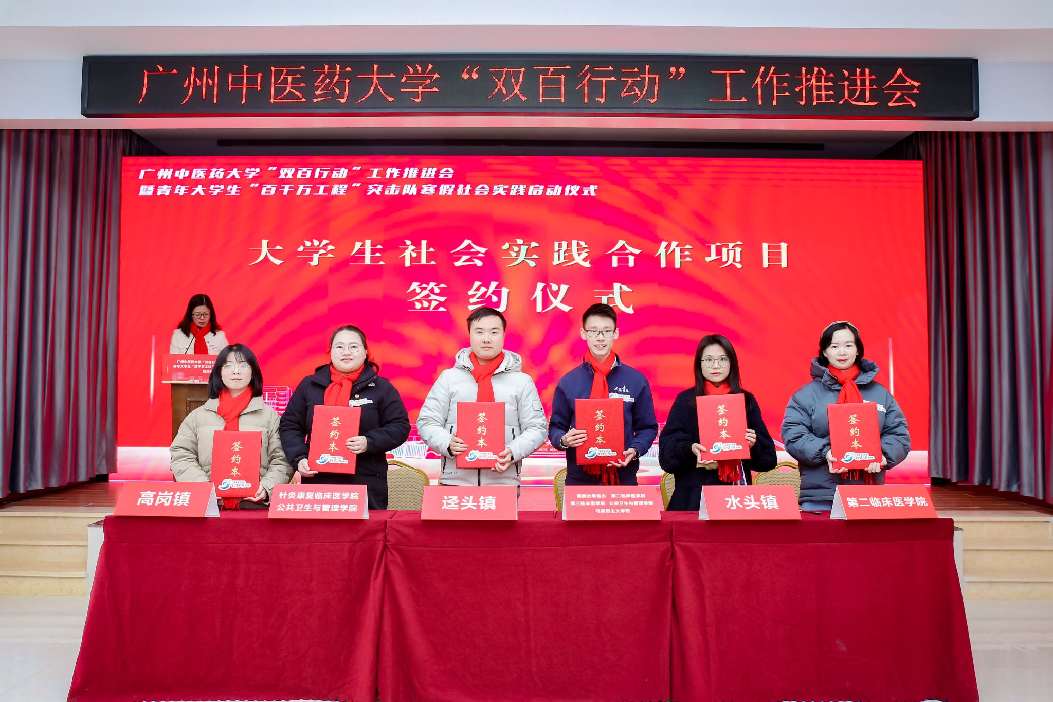 On the afternoon of January 24th, Guangzhou University of Chinese Medicine (GZUCM) held the work promotion meeting for the “Double Hundred Action” and the winter social practice launch ceremony for the “Hundred Counties, Thousand Towns, Ten Thousand Villages High-Quality Development Project” College Student Youth Task Group in Shuitou Town, Fogang County, Qingyuan City. Qiu Yahong, Deputy Secretary of the CPC GZUCM Committee, Zhai Xuemei, Deputy Secretary of the Qingyuan Municipal Party Committee, and Fan Chun, Deputy Secretary of the Provincial Committee of Guangdong Youth League, unveiled GZUCM Fogang Work Station for the Guangdong “Hundred Counties, Thousand Towns, Ten Thousand Villages High-Quality Development Project” College Student Youth Task Group and GZUCM Fogang “Double Hundred Action” Social Practice Base.