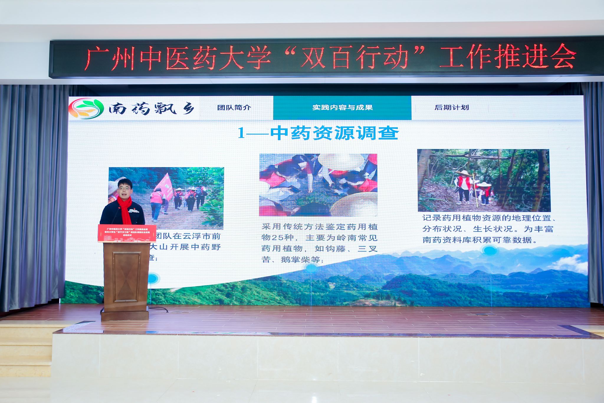 Zhai Xuemei, Deputy Secretary of the Qingyuan Municipal Party Committee, said that Qingyuan City is implementing the “Ten Major Action Plans”, promoting Guangzhou-Qingyuan integration with high quality, making every effort to create a main battlefield and preferred destination for the orderly transfer of industries from the Pearl River Delta, and vigorously carrying out the “Hundred Counties, Thousand Towns, Ten Thousand Villages High-Quality Development Project”. The city is advancing the ecological construction of green and beautiful Qingyuan with high standards, and providing new opportunities for the youth. She encouraged young people to seize the opportunities and make the most of their talents in the vast rural areas where there is much to do, so as to make new and greater contributions to Qingyuan and to Guangdong’s “Hundred Counties, Thousand Towns, Ten Thousand Villages High-Quality Development Project”. Fan Chun, Deputy Secretary of the Provincial Committee of Guangdong Youth League, said the event is an effective measure to fully implement the “Double Hundred Action” and to advance the “Youth Task Group Action”. Fan commended GZUCM for its active action of the Guangdong “Hundred Counties, Thousand Towns, Ten Thousand Villages High-Quality Development Project” College Student Youth Task Group. As the “Excellent Organizational Unit”, the university mobilized over 2500 teachers and students to address grassroots issues in counties and rural areas, and forged various signature projects like “Amomi FructusPromoter” and “Southern Chinese Materia Medica Drifting to Villages”, demonstrating the youthfulness of GZUCM students. He encouraged students to make good use of the opportunities and the platform, view counties and towns as fertile ground for innovation and entrepreneurship, contribute their practical achievements to the well-being of the people, and showcase the splendor of youth in Guangdong’s journey of high-quality development.