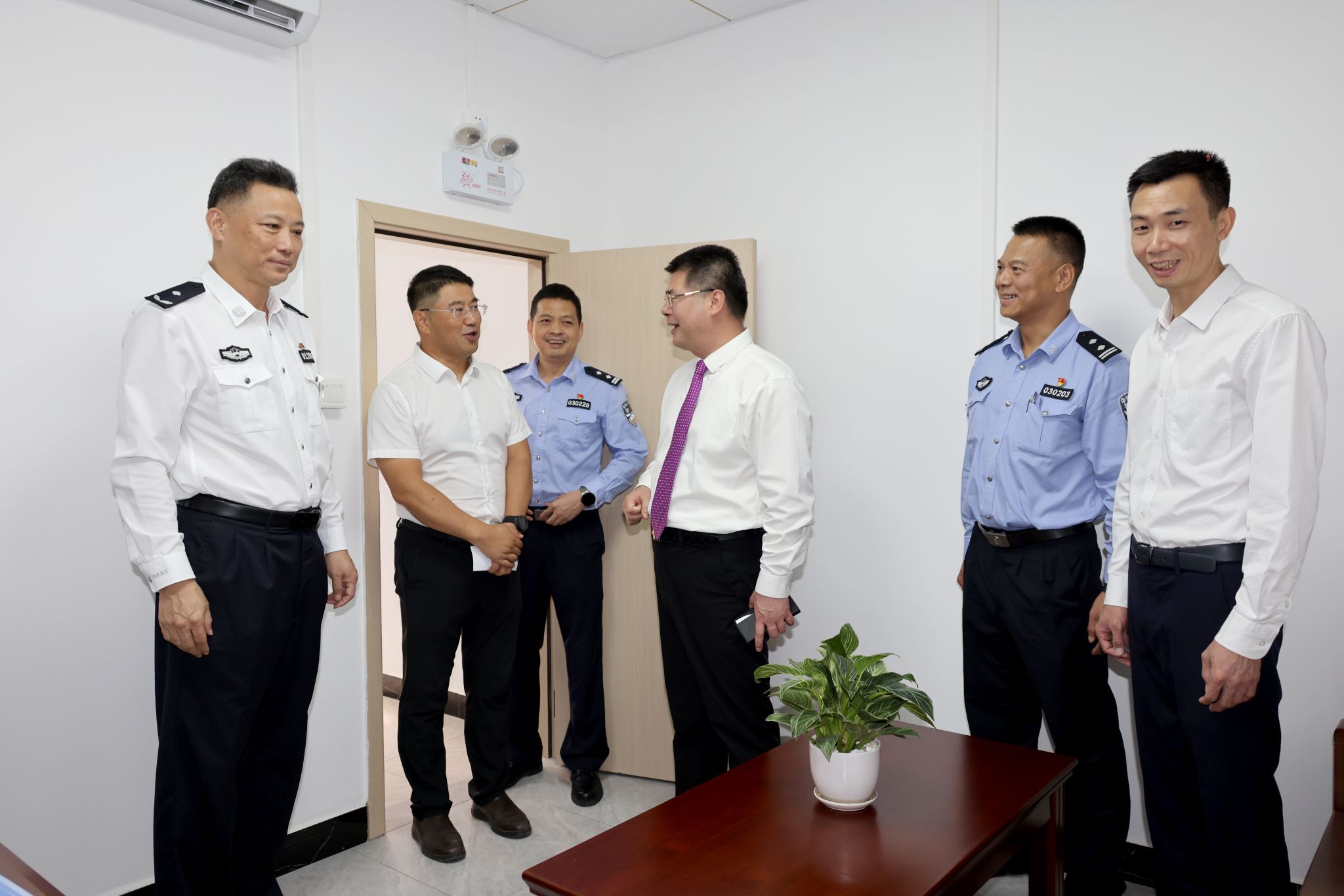 揭牌仪式后,陈文锋、葛林飞等领导参观三元里校区警务室,并对三元里校区警务室后续管理、运作提出要求。