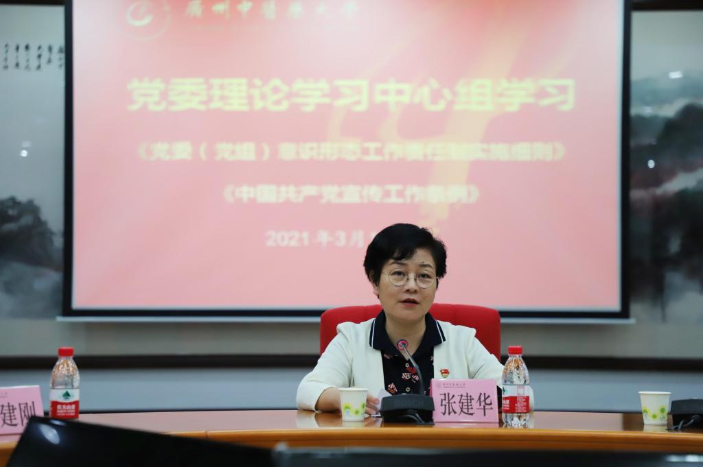 2021年3月17日下午,学校党委理论学习中心组在大学城校区办公楼101会议室专题学习中共中央办公厅新修订的《党委(党组)意识形态工作责任制实施办法》、广东省委办公厅新修订的《广东省党委(党组)意识形态工作责任制实施细则》和《中国共产党宣传工作条例》。全体校领导,学校党委理论学习中心组成员参加。学校党委书记张建华主持会议。