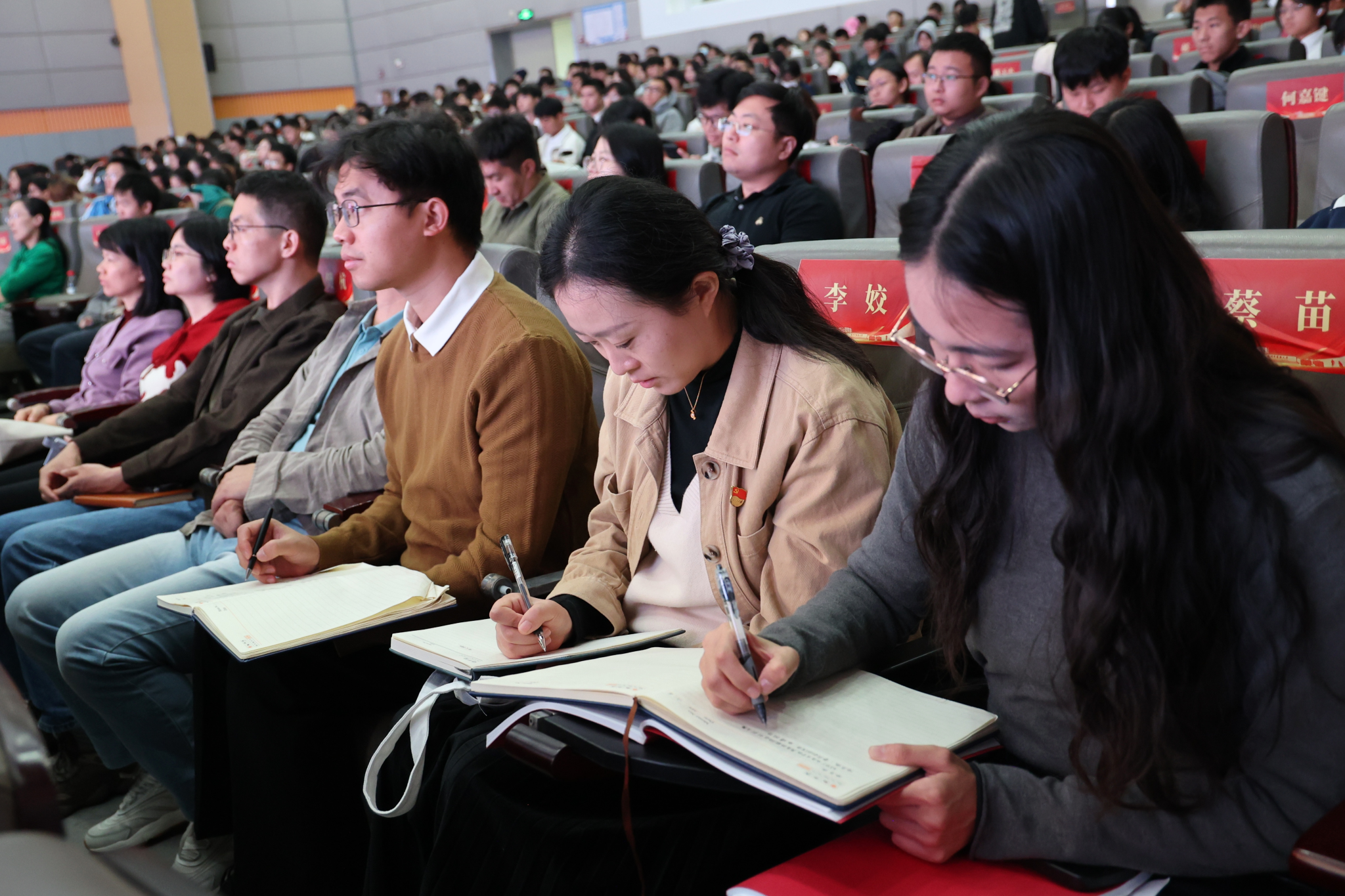 学校领导,党委理论学习中心组成员、各学院分管学生工作副书记、校本部教工和学生党支部书记、全体辅导员、马克思主义学院思政课教师代表、青马班学员代表、学生代表等近500人参加。