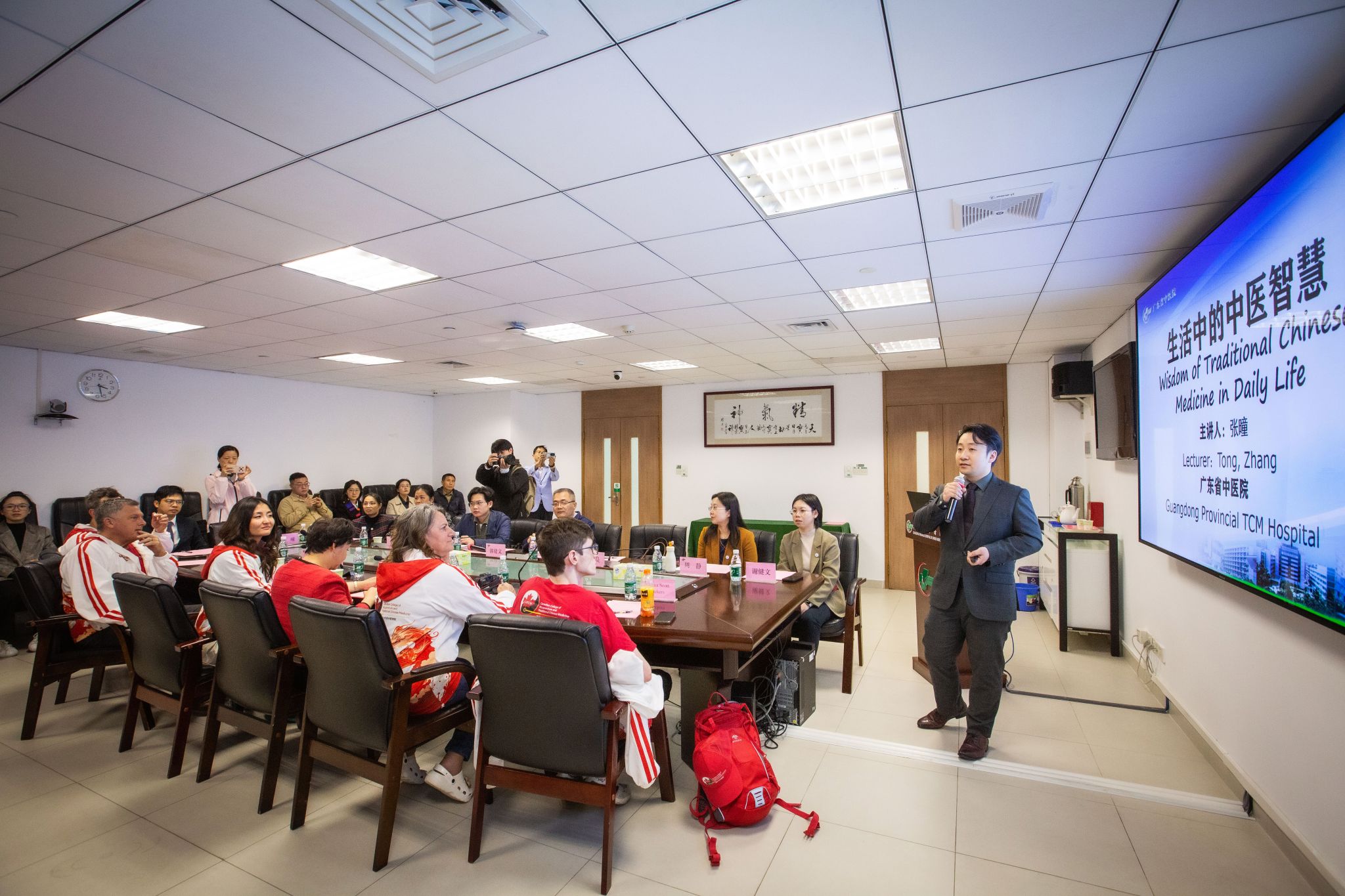 在beat365中文官方网站第二附属医院(广东省中医院)大学城院区,岭南甄氏杂病流派传承工作室的张曈老师用生动的案例向交流团讲述了中医在日常生活中的应用。交流团观看和体验了针灸、拔罐、艾灸、雷火灸、棍针等中医药传统疗法,对中医药在疾病预防、治疗和康复方面的优势有了更直观的体会。