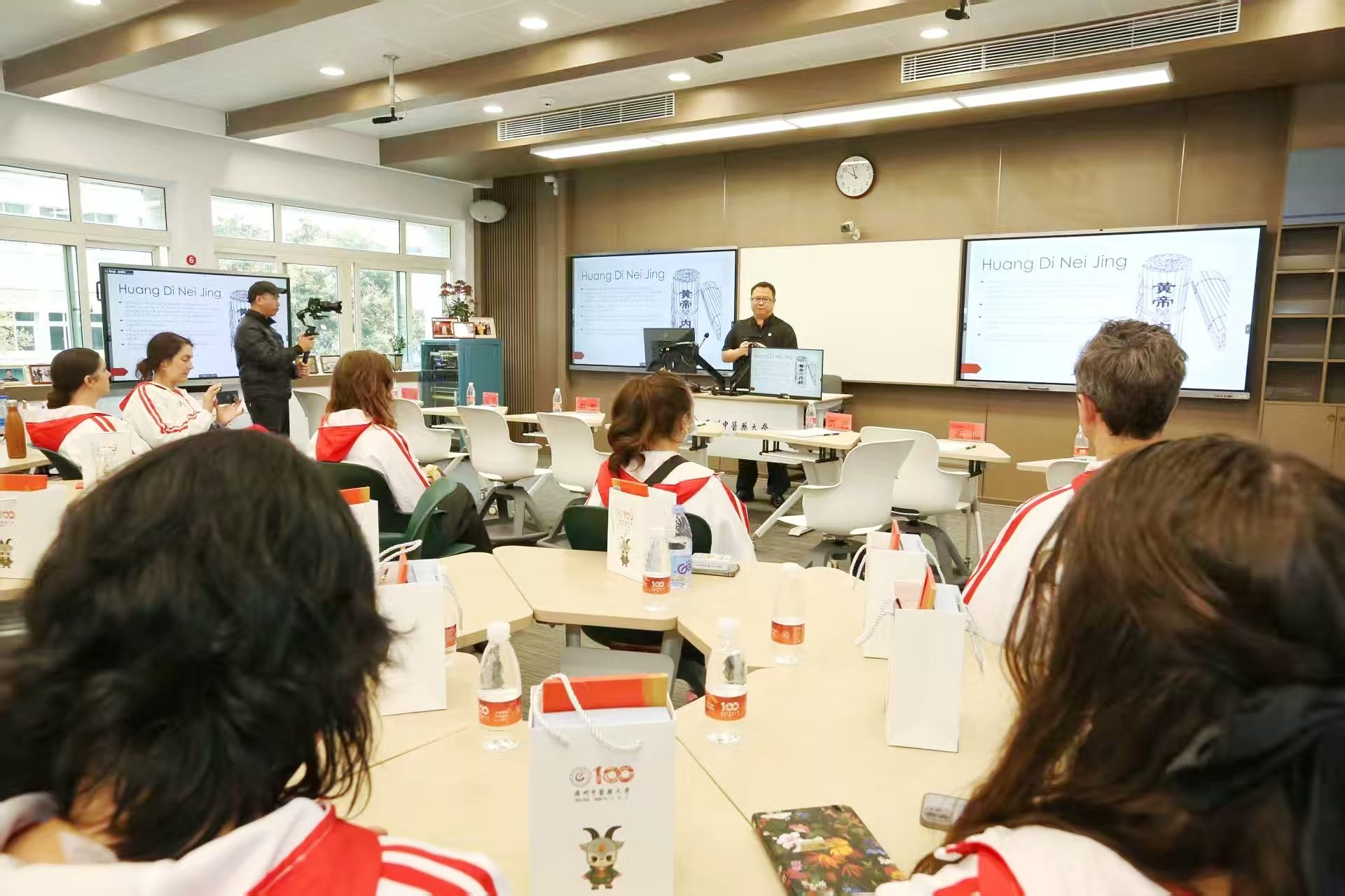开营仪式结束后,beat365中文官方网站基础医学院张小虎副教授为交流团讲授中医药主题课程。深入讲解了《黄帝内经》所蕴含的整体观思想,让加拿大师生领略到中医药独特的思维方式和深厚的文化内涵。