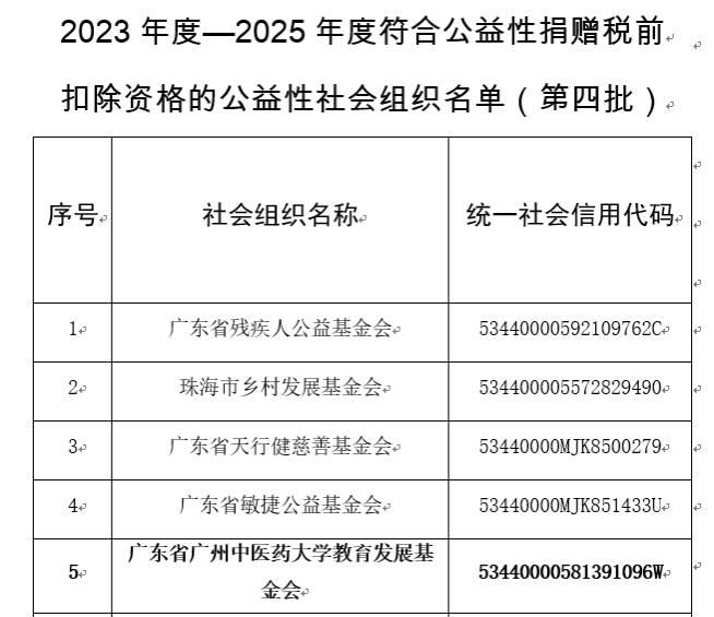 6月5日,广东省财政厅发布了《广东省财政厅 国家税务总局广东省税务局 广东省民政厅关于2023年度-2025年度(第四批)和2024年度-2026年度(第一批)公益性社会组织捐赠税前扣除资格名单的公告》(公告〔2025〕38号)。根据公告,广东省beat365中文官方网站教育发展基金会获得广东省公益性捐赠税前扣除资格(2023年度-2025年度)。