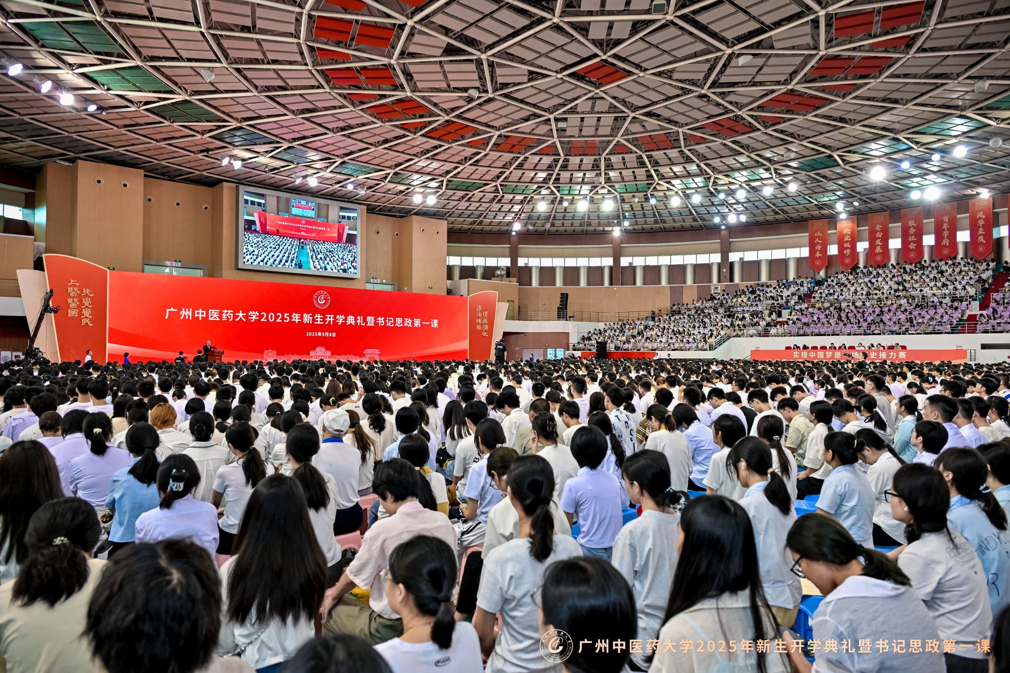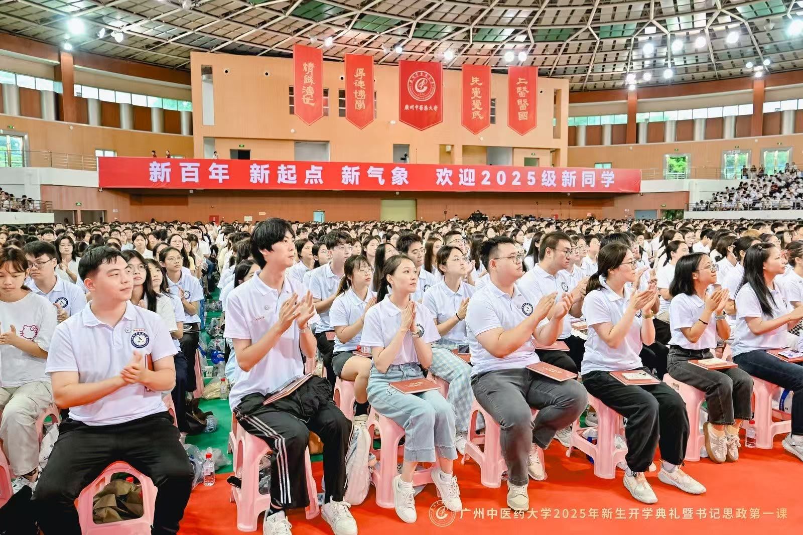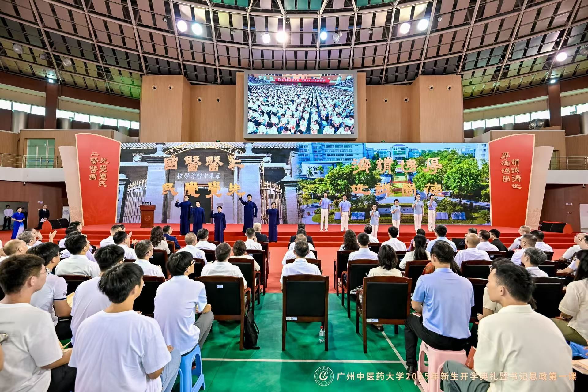 9月8日上午,beat365中文官方网站2025年新生开学典礼暨党委书记“思政第一课”在大学城校区体育馆举行。在beat365中文官方网站建校新百年的第一年,6000余名2025级新生,现场聆听通过AI技术还原的首任校长卢乃潼开学日训词,以一场跨越时空的“双向奔赴”,正式开启“广中医人”的新身份。