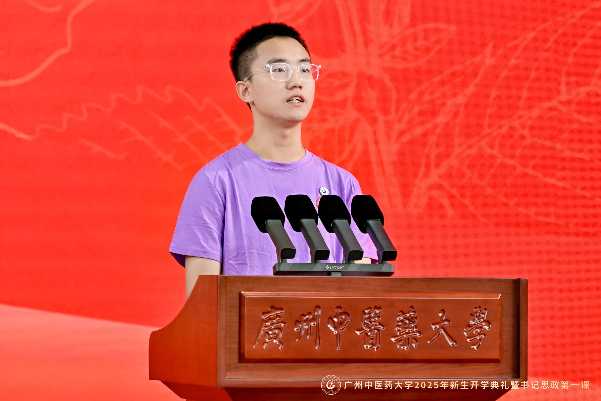 在校生代表2020级学生陈嘉慧同学以“我们是谁”“我们从哪里来”“我们要往哪里去”三问,与新生共勉,作为从百年薪火中走来的广中医人,秉承“厚德博学、精诚济世”校训的岐黄传人,要潜心经典,也要勇于实践,朝着守正创新、走向国际的目标前进,共同书写无悔的青春华章!