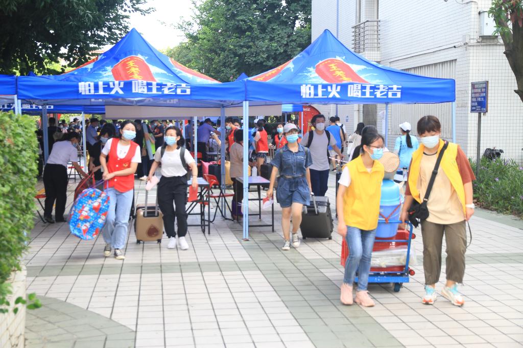 由于疫情防控的需要,今年迎新现场新生家长和送行车辆不能进入校园。学校和各学院为此安排了大量志愿者,在门岗处接新生到校内报到点,并帮新生搬运行李,做好引导和服务工作,提升了新生报到的效率,帮助新生尽快融入大学校园生活。