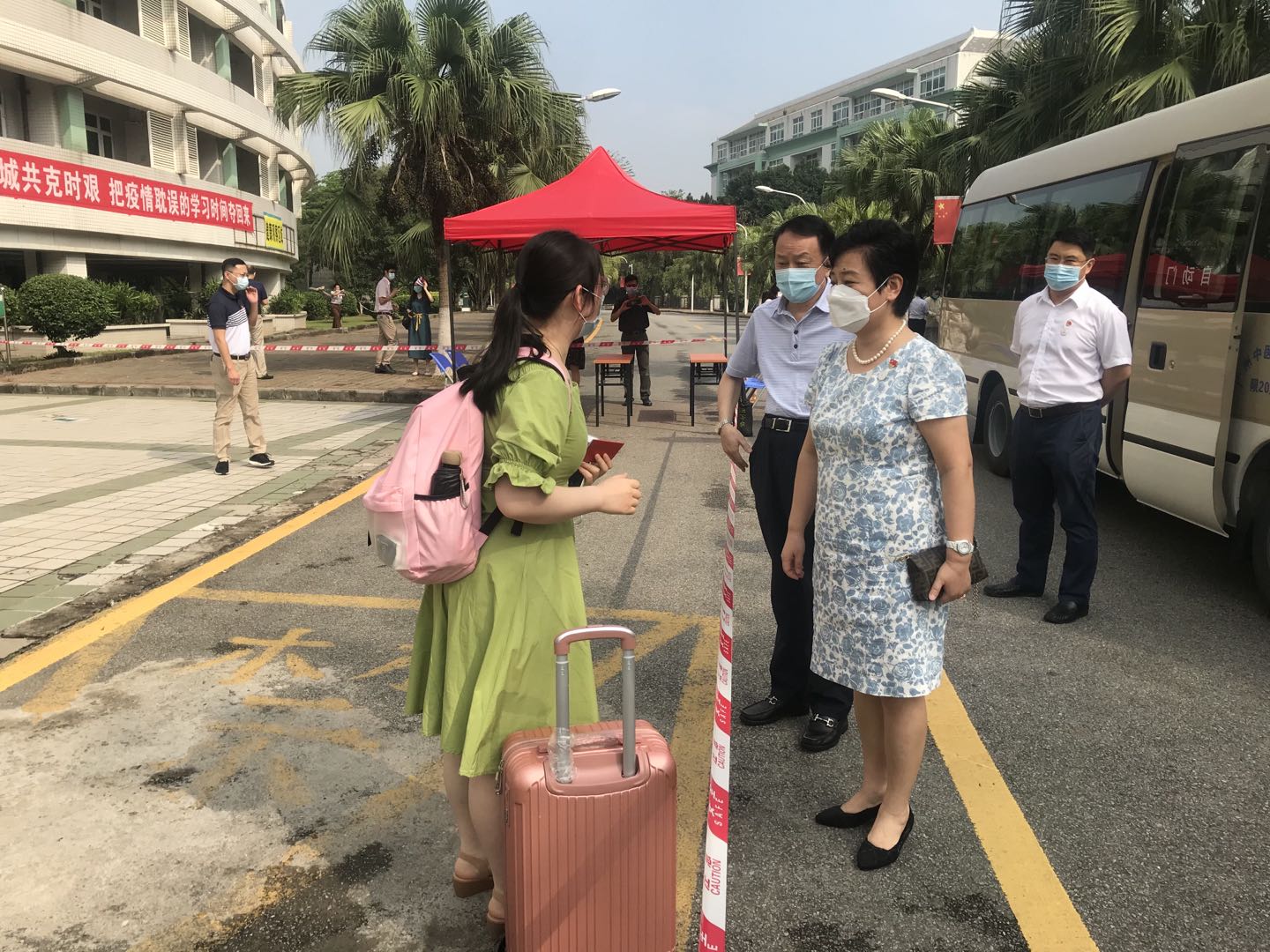 5月11日,beat365首批学生128人顺利返校报到。学校党委书记张建华、校长王省良、副校长潘华峰及相关部门、二级学院负责人到现场迎接慰问返校学生。