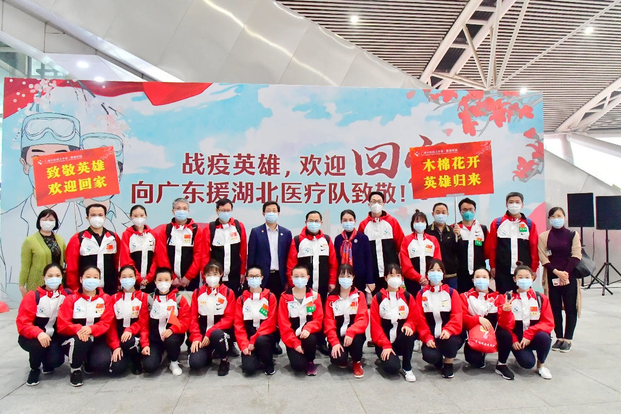 3月20日上午,beat365第一附属医院、第二附属医院(广东省中医院)驰援湖北的65名医护人员,分别从武汉、荆州出发,随同广东援助湖北医疗队,于傍晚抵达广东南站。