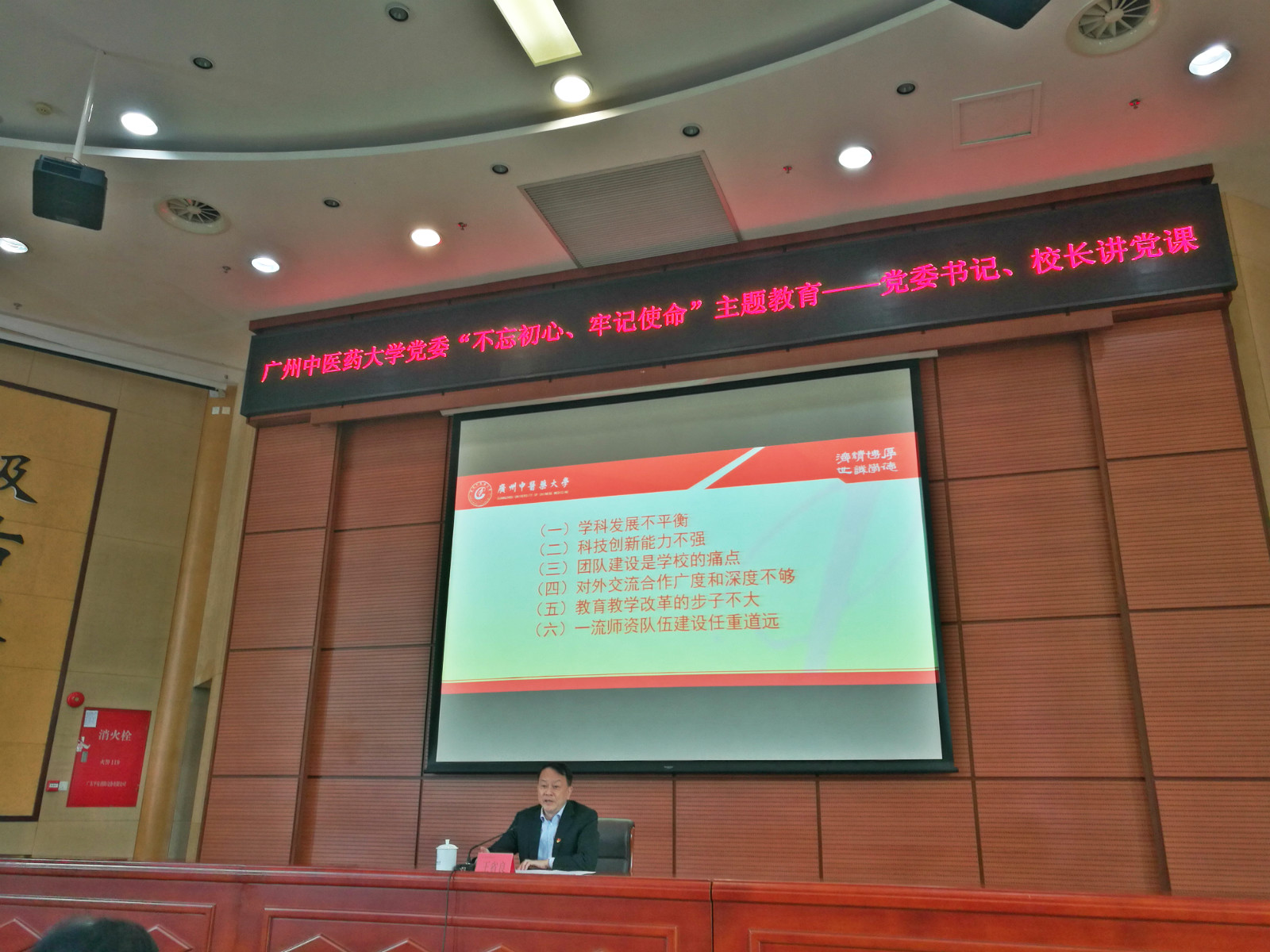 王省良上题为《“不忘初心,牢记使命”,为建设一流中医学科和高水平中医药大学而奋斗》党课并传达习近平总书记对中医药工作的重要指示和李克强总理对中医药工作的重要批示。围绕上课主题,他从“双一流”建设的任务、beat365的建设成效、存在的问题、改进的措施四个方面作了详细讲解。他解读了学校的“初心”和“使命”:即高等中医药教育发展的初心,传承发展中医药事业的初心;培养高素质人才的使命以及服务大健康产业的使命。他分析了学校学科建设、科技创新、教育教学、医院建设、师资队伍建设五个方面的建设成效,同时指出了学校存在学科发展不平衡、科技创新能力不强、团队建设不足、对外交流合作广度深度不够、教育教学改革的步子不大、一流师资队伍建设任重道远等突出问题。
