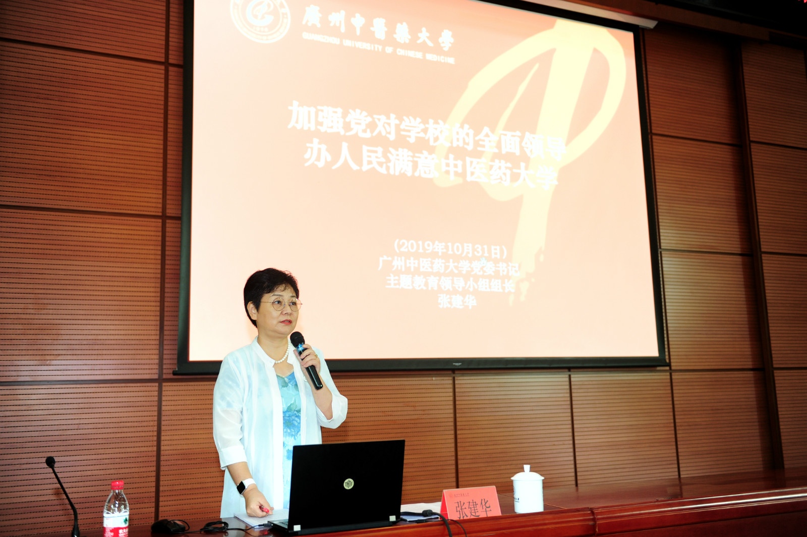 张建华的党课题为《加强党对学校的全面领导,办人民满意中医药大学》。她引述习近平总书记在全国高校思想政治工作会议、全国教育大会等重要会议上关于加强党对高校全面领导的重要论述,指出加强党的领导是落实立德树人根本任务的内在要求,是推进“中国特色、世界一流”中医药大学建设的根本保障,也是加快学校综合改革的组织保障。她介绍了学校党委加强党对学校全面领导的主要做法:一是举旗定向,强化思想政治建设;二是加强班子建设,落实党委领导下的校长负责制;三是加强思政教育,守好意识形态安全南大门;四是加强干部队伍、人才队伍建设,激发创新创造活力;五是推进校院二级综合改革,释放办学活力;六是强化党建责任,从严从实加强基层党建。结合主题教育开展的调研工作,张建华就发挥学校党委领导作用的调研结果作详细解析。调查结果显示,受调查者在20个方面对党委的领导作用满意度平均91.7%,其中最为满意的是党管教育方向95.2%,依法办事95.2%,党委引领精神文化94%。