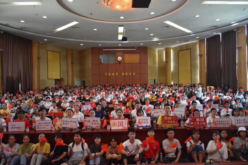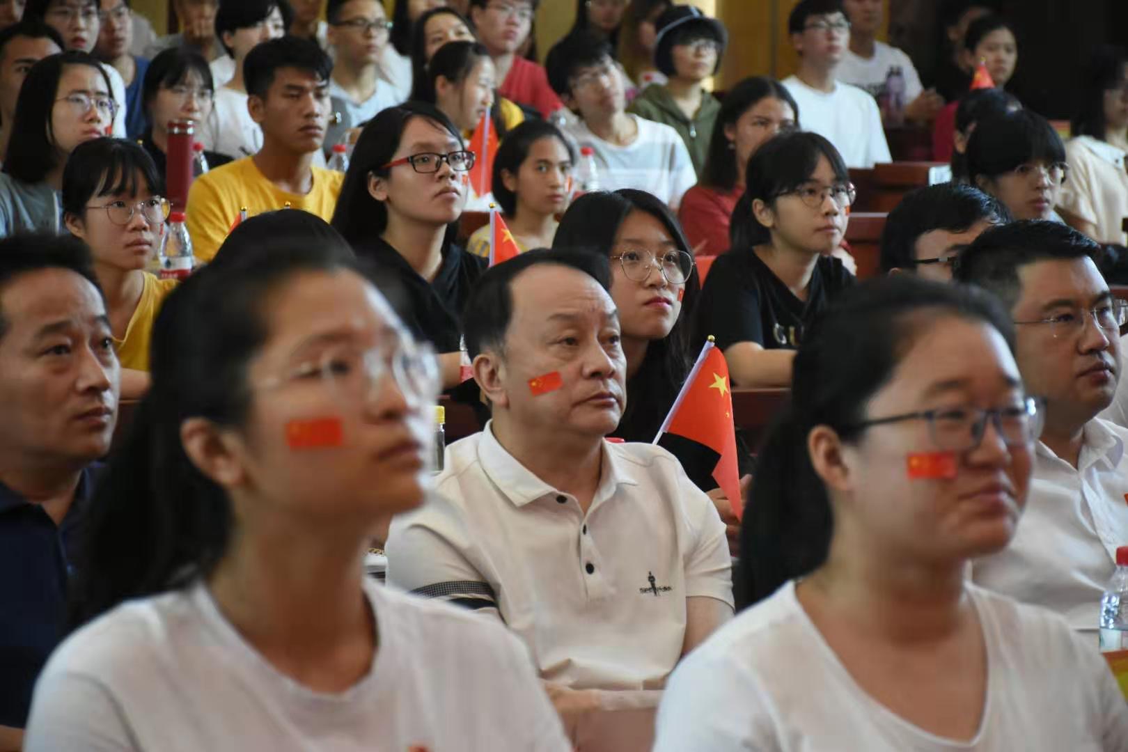 同学们怀着无比喜悦激动的心情,早早集合在学校学术报告厅。大家穿着节日盛装,手握小国旗,脸上贴着“国旗”,洋溢着节日的快乐和喜庆,共同见证激动人心的历史时刻,大家为祖国辉煌成而骄傲,现场响起阵阵热烈的掌声。