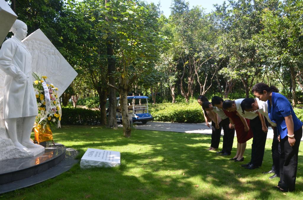 学校领导来到叶欣纪念塑像前献上花篮,凭吊叶欣烈士,向这位抗击“非典”的英雄表达崇高的敬意和深情的缅怀。张忠德回忆起当年他与叶欣搭档并肩抗击“非典”的经历。在这场没有硝烟的战争中,他们不顾个人生命安危,主动承担了对急危重“非典”病人的检查、抢救、治疗、护理工作,一起负责处置危重患者。这些身边的先进典型,体现了卫生与健康工作者的使命担当,也是广东省中医院鲜明的文化记号。