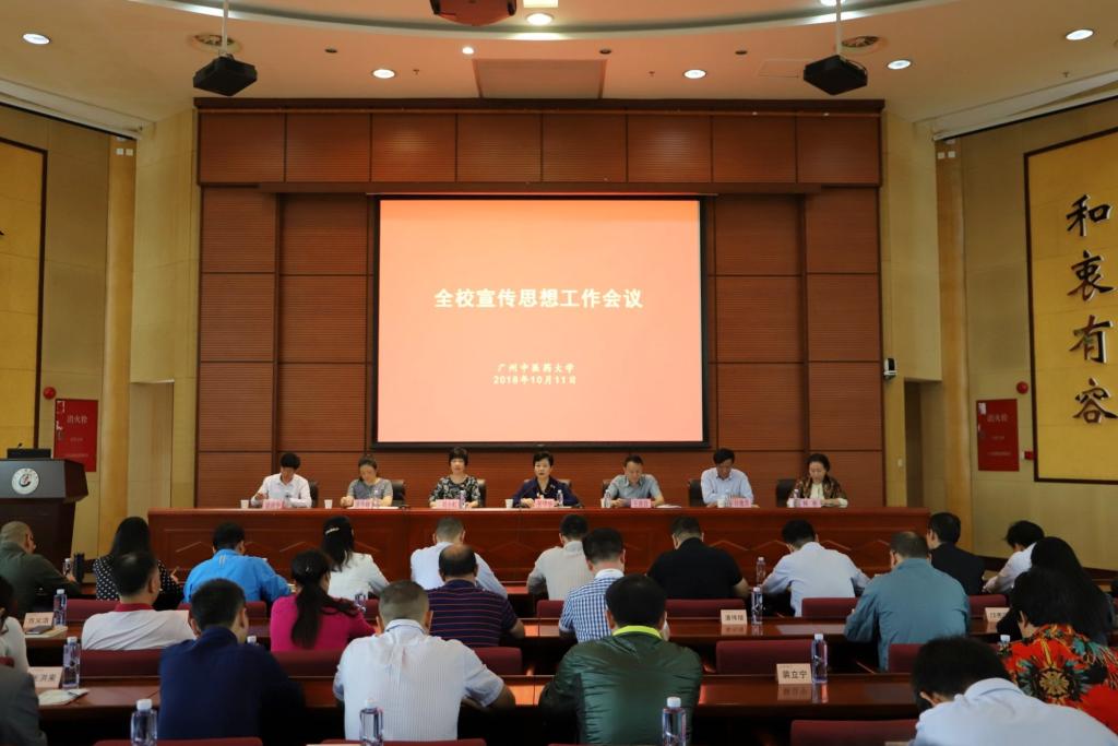 张建华强调,全面推动学校宣传思想工作要抓住关键,突出重点。举旗帜,就是要高举马克思主义、中国特色社会主义的旗帜,坚持不懈用新时代中国特色社会主义思想武装全校党员、教育师生、推动学校工作,在学懂弄通做实上下功夫,推动当代中国马克思主义、21世纪马克思主义深入人心、落地生根。聚民心,就是要牢牢把握正确舆论导向,唱响主旋律、壮大正能量,做大做强主流思想舆论,把全校师生士气鼓舞起来、精神振奋起来,朝着“双一流”和高水平大学建设的目标,团结一心向前进。育新人,就是要坚持立德树人、以文化人,建设社会主义精神文明、培育和践行社会主义核心价值观,提高师生思想觉悟、道德水准、文明素养,履行好培养担当民族复兴大任的时代新人的重要职责。兴文化,就是要坚持中国特色社会主义文化发展道路,推动中医药传统文化创造性转化、创新性发展,传承和发展中医药文化。展形象,就是要讲好中国故事、中医故事、广中医故事,传播好广中医声音,向外界展现真实、立体、全面的beat365中文官方网站,提高广中医文化软实力和影响力。