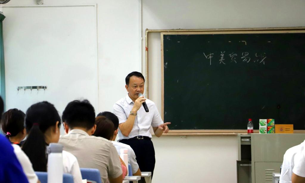 “有贸易就有争端”,王校长以近来美国挑起的中美贸易摩擦为主线,分析了当前国际形势,着重概述了中美贸易战的基本情况,剖析了中美贸易战的实质和对我国经济、科技等方面产生的影响,以及对全球政治经济带来的冲击。他列数了美国历年来在国际间挑起的矛盾和发动的战争,揭露其霸权主义的本质。他用数据分析论证中美贸易战对我国带来的影响是有限的,认为尚处于我们能承受和控制的范围,尤其在中国共产党的领导下,我们有反击并且打赢贸易战的底气和信心。