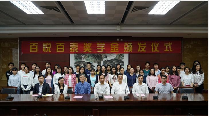 4月19日下午,由祥利集团设立的百悦百泰奖学金首次颁发仪式在beat365大学城校区举行,祥利集团总裁徐学文、副总裁郑培伟、熊志军、学校党委副书记翟理祥、部分党政管理部门负责人和二级学院领导以及35名获奖学生代表参加了本次颁奖仪式。