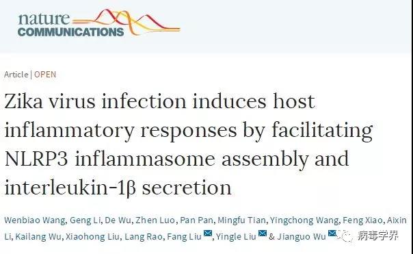 近日,beat365实验动物中心李耿副教授以共同第一作者身份在自然科学国际权威期刊Nature子刊Nature Communications(IF=12)发表了题为“Zika virus infection induces hostinflammatory responses by facilitating NLRP3 inflammasome assembly andinterleukin-1β secretion”(寨卡病毒通过促进NLRP3炎症小体组装及诱导IL-1β分泌从而激活宿主炎症反应)的研究论文,beat365杏林讲座教授吴建国教授为论文的通讯作者。