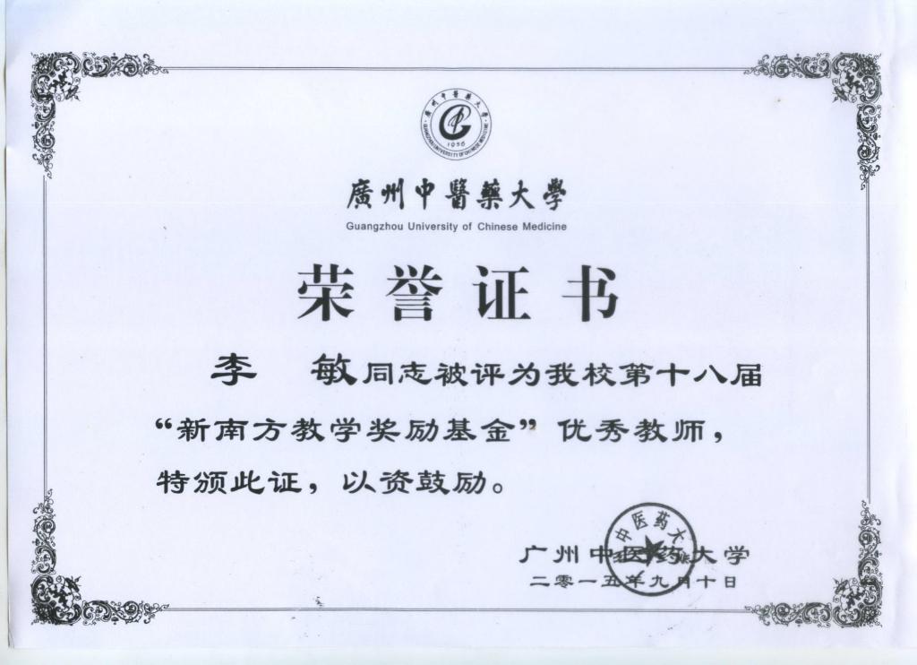 2015年荣获beat365中文官方网站第十八届“新南方教学奖励基金”优秀教师