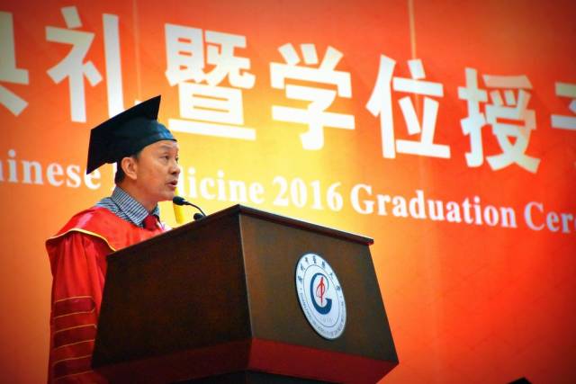 校长接着说“雅”,“古代文人有四雅——琴棋书画,在同学们即将离校之际,我再送你们新的四雅——‘情、气、术、化’”。所谓“情”,是希望你们能永远饱有激情、不失温情。即使逐梦之路险阻重重,也别让坚硬的现实,消磨本来的自己,坚守心底深处的柔软与温情,勿忘初心。所谓“气”,是希望你们能永远坚守勇气、学会大气。“浩荡入溟阔,志泰心超然”,用你们青春的锐气去解构世俗傲慢、用你们宽阔的胸襟去拥抱不尽如意,序幕才开启、青春不退役。所谓“术”,是希望你们能秉承学术、精于业术。你们研习着被毛泽东誉为“中国对世界第一大贡献”的中医学,继承着古往今来无数先贤的毕生经验,你们天然地拥有了千年的智慧与功力。所谓“化”,是希望你们能革故鼎新、继往开来,跟上时代的步伐。别人的宋仲基可以带着韩国炸鸡来到中国,相信你们也能够带着中医药走向世界,传承与创新,这应当是我们广中医学子的自觉与自信。