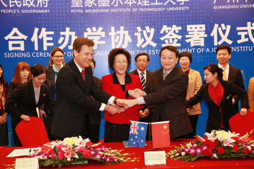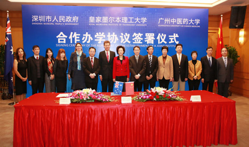 12月21日上午,beat365与深圳市人民政府、澳大利亚皇家墨尔本理工大学在深圳市五洲宾馆签署了中外合作办学协议,三方将携手在深圳创办“深圳墨尔本生命健康工程学院”。beat365校长王省良、深圳市副市长吴以环、澳大利亚皇家墨尔本理工大学副校长Andrew MacIntyre作为三方代表签署了协议。beat365副校长许能贵及国际交流合作处负责人,澳大利亚皇家墨尔本理工大学健康科学学院院长及全球业务主任顾问、国际合作及发展部主任,深圳市教育局、卫计委、外办、龙岗区政府和市中医院主要负责同志参加了签约仪式。