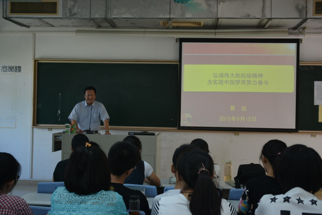 这是9月15日,学校党委书记黄斌给第一临床医学院15级铁涛班新生们上新学期第一堂思想政治理论课的导入镜头。在今年的第二个学期开头,黄斌再度走进课堂给学生上第一堂思政课,主题是"弘扬伟大的抗战精神,为实现中国梦而努力奋斗"。今年上学期,他给护理学院同学们讲授了"积极培育和践行社会主义核心价值观"。