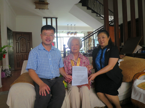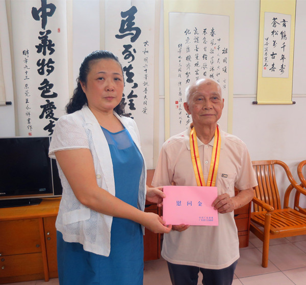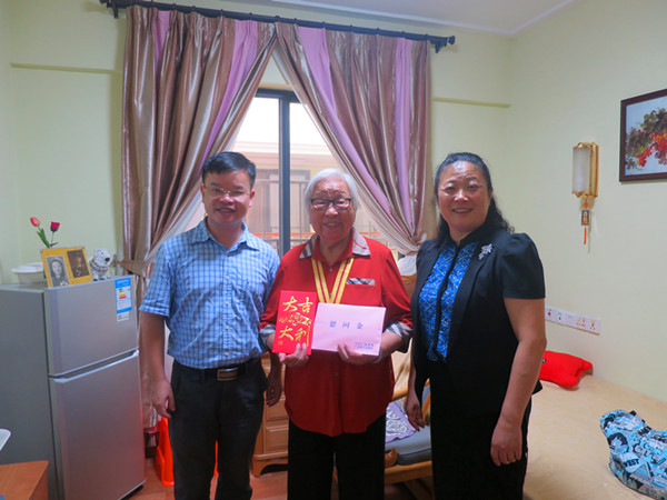 在抗战胜利70周年纪念日前夕,受学校党委委托,副校长潘华峰前往广州各区和深圳等地慰问曾在beat365工作的抗日老战士、老同志,转达省委、省政府以及学校对他们的崇高敬意和诚挚问候,为他们送上中国人民抗日战争胜利70周年纪念章,以及省财政统一发放的5000元慰问金和学校专门发放的2000元慰问金。离退休工作处负责同志陪同慰问。