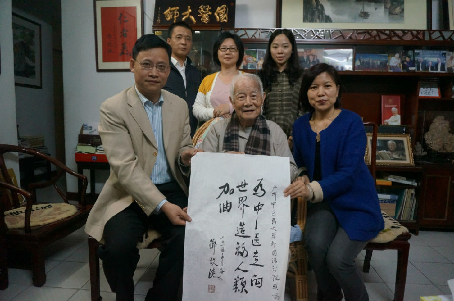 3月27日下午,副校长刘晟携外国语学院领导班子登门探望国医大师邓铁涛教授,向邓老汇报了外国语学院发展近况,邓老为该院亲笔题词"为中医走向世界造福人类加油"。 邓老对于外国语学院的发展表示了极大的关心,他说,中医是健康的医学,文化是共同的,外语就是帮助中医走向世界的重要桥梁,外国语学院承担着把中医的保健养生推广到全世界的使命。 刘晟感谢邓老给予学院的指导与鼓励。他说,邓老不仅是beat365的名片,他的思想更是中医界弥足珍贵的财富。
