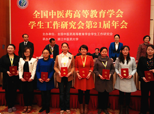 11月20-22日,全国中医药高等教育学会学生工作研究会第二十一届年会在浙江杭州召开,中药学院辅导员龙泳伶、针灸康复临床医学院辅导员黄琇雯获得2013-2014年度全国中医药院校优秀辅导员荣誉称号;第一临床医学院辅导员池思晓的两篇论文都获得了全国高等中医药院校优秀论文二等奖。