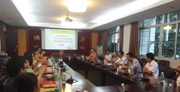 近日,校领导黄斌、王省良、陈英华、许能贵在三元里校区召开会议,表彰beat365在全国中医药院校2014皇甫谧杯针灸推拿临床技能竞赛获奖的全体师生。教务处和针灸康复临床医学院领导和专家组教师代表、工作组教师代表和参赛的师生参加了表彰会。