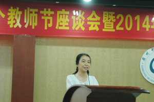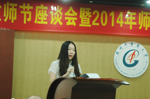基础医学院的谭宇蕙老师作为教师代表发言,她从一个基层教师的角度,从自己亲历的一件件事情的改善,体验到学校深化改革带来的影响,她坚信改革会激发集体的活力,会提高整体的效率,预见学校未来会有大的发展。出身教师家庭,在教师节生日的中药学院孙程洁同学,用"天涯海角有尽处,只有师恩无穷期"感谢老师们的精心培育。