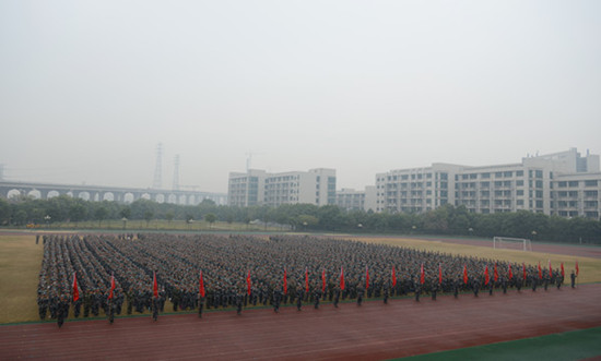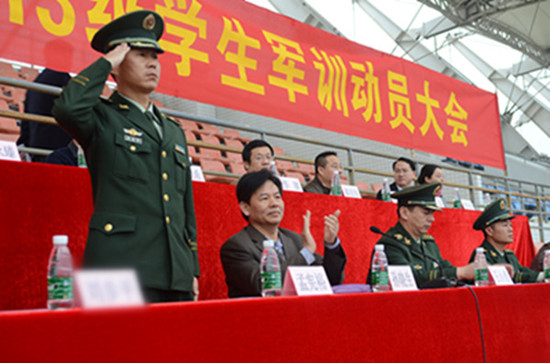 1月8日,2013级学生军训动员大会在大学城校区教学区体育场隆重举行,拉开了2013级学生军事技能实操训练的序幕。副校长孙晓生教授、承训部队武警广州指挥学院大队政委王小勇上校分别作了动员讲话。 本次军事技能实操训练为期十天,参训学生3072名,将进行单兵徒手队列动作、操枪、战伤救护、野营拉练和生存抗灾等内容。 孙晓生副校长,承训部队武警广州指挥学院大队政委王小勇上校,军训团团长孟宪裕少校,军训团政委吴文海少校,党委办公室、宣传部、学生处、团委、武装部等职能部门及各学院领导出席了动员大会。