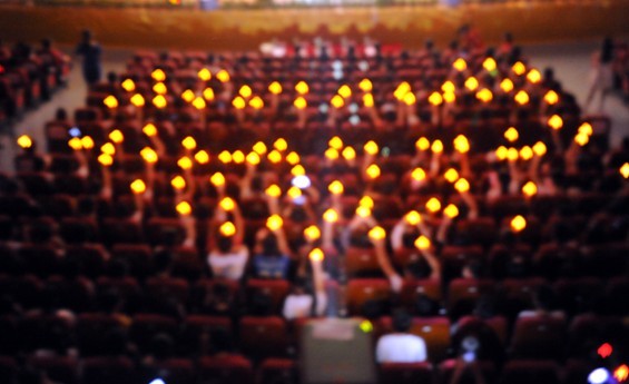 晚会伊始,师生代表点亮了情系雅安的"祈福蜡烛",一点点微弱的烛光汇聚成爱的心形, 伴随着《让世界充满爱》的歌声和相关回顾视频,现场观众重温了beat365支援雅安地震灾区的情况。