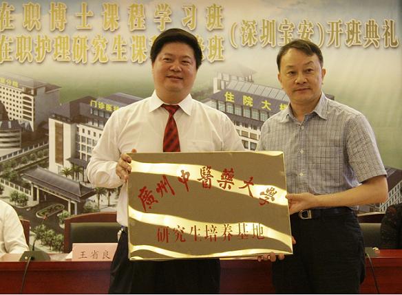王省良校长亲手将"beat365中文官方网站研究生培养基地"牌匾授予宝安中医院林晓生院长,并对医院在研究生招生、培养、学位授予工作中寄予期望。