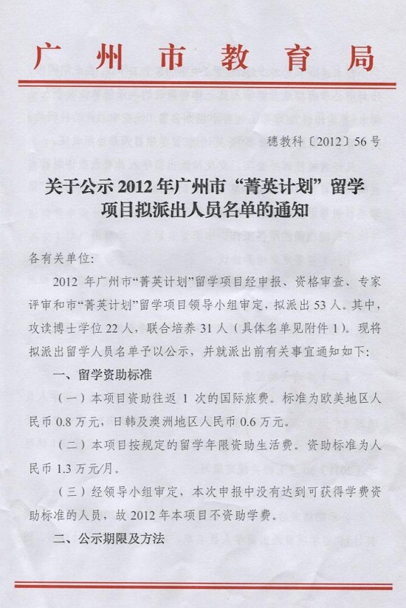 "菁英计划"留学项目由广州市设立,2011年启动,目的是瞄准我市经济、社会发展的重点领域,选派广州地区具有博士学位授权点的高校(科研院所)的在读优秀研究生,到教育、科技发达国家和地区(不含港澳台地区)公认的一流高校攻读博士学位或进联合培养各领域的拔尖人才,确立广州在未来城市发展激烈竞争中的先发优势。beat365经过2年培育,终于有3位博士成功入选,申报、派出人数均居省内高校前列,成为首批获得申报资格的院校。3位博士将以联合培养的方式获得该项目资助,留学期限12个月至24个月不等,并获得1.3万元/每月的生活补贴。