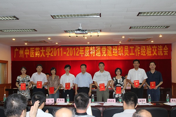 首先,陈文锋部长宣读了学校党委《关于表彰2011-2012年度特邀党建组织员工作先进集体和先进个人的通知》(广中党组〔2012〕16号)。随后,黄斌书记向第一临床医学院党委等8个单位颁发了先进集体奖。接着,在主席台就座的领导分别向马定科等19位优秀特邀党建组织员和史志云等5位先进特邀党建组织员颁了奖。
