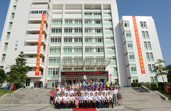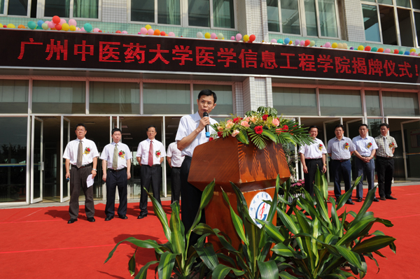 5月23日上午,大学城校区工科楼前彩旗飘扬、花团锦簇,医学信息工程学院揭牌仪式系列活动举行。省中医药局副局长李梓廉到场祝贺,学校党委书记黄斌、校长王省良、副书记陈英华、副校长郭姣,党办主任邝卫红、校办主任林辉,及医学信息工程学院、信息中心全体老师和学生代表出席活动。