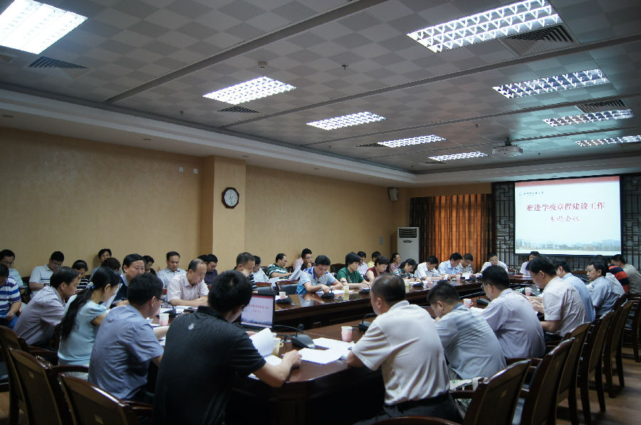 会上,校长办公室刘步平副主任首先传达了教育部《高等学校章程制定暂行办法》研讨培训班的有关精神,对该办法的出台背景、重要内容、落实措施等进行了解读,并介绍了国内几所知名大学在章程建设方面的经验。随后,监察处方义洁处长通报了学校自2009年启动大学章程建设工作以来所进行的前期工作和取得的初步成果,并对已形成的学校章程初稿进行了简要说明。各职能部门及二级单位代表立足各自工作权责,着眼于通过学校章程制订来进一步完善优化相关管理制度,谈了各自的看法和设想。接着,校长办公室林辉主任介绍了进一步推进学校章程建设的工作方案(征求意见稿),该方案分指导思想、目标任务、组织领导、工作分工、工作步骤、工作要求6个部分,为学校进一步推进章程建设提供了具体"路径"。与会人员讨论并通过了该方案。