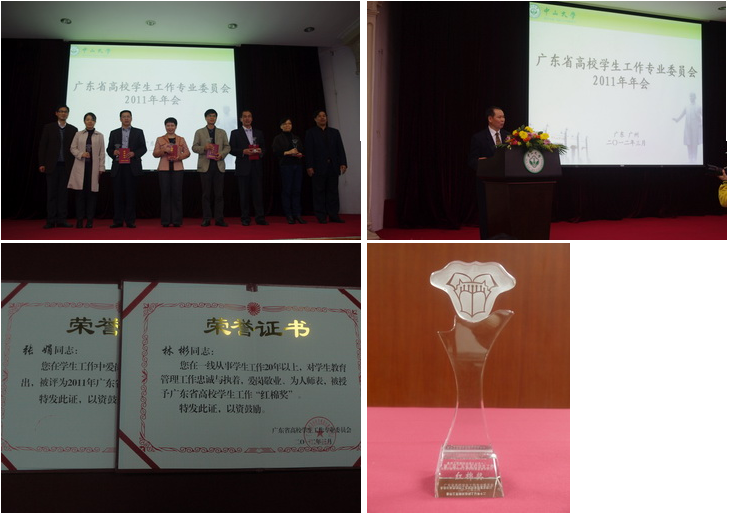 会议对获得"第三届广东省高校学生工作红棉奖"和"2011年广东省高校学生工作先进个人"的个人进行了表彰。beat365学生处处长林彬老师荣获2011年广东省高校学生工作"红棉奖",张娟老师获"2011年广东省高校学生工作先进个人" 荣誉称号。2011年全省共评出学生工作"红棉奖"29名,学生工作先进个人96名,其中学生工作"红棉奖"要求参选者从事学生工作累计20年以上。