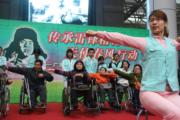3月5日是学雷锋日,在第二附属医院(广东省中医院)的健康广场上,十几位坐在轮椅上的特殊朋友在医院医护人员的带领下,打起了医院为他们特别编排的强身健体保健操——"轮椅上的八段锦"。该院医务人员在一次专门为残疾人开展的健康教育过程中,得知健康养生知识多为普通人设计,往往忽略残疾人的特殊情况,医务人员便把这件事情牢牢记在心中,专门成立了助残"学雷锋"小组,并编排了专门为残疾人设计的"轮椅上的八段锦",而且还将定期开展针对残疾人朋友的健康活动。"轮椅上的八段锦"也拉开医院今年开展学习雷锋精神系列活动的序幕,现场还举行了大型"学雷锋"义诊及健康宣教活动。