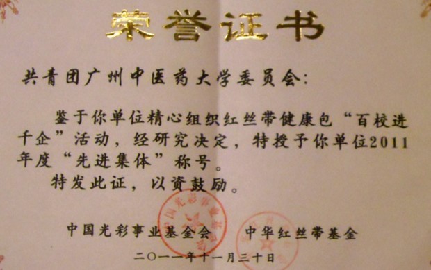 11月30日,由全国工商联和国务院艾滋病防治工作委会员会办公室共同主办,共青团中央、卫生部等7部委作为支持单位,中华光彩事业基金会、中华红丝带基金承办的"大爱暖中华——2011世界艾滋病日主题公益活动"表彰晚会在北京大学百年讲堂举行,beat365团委荣获中华光彩事业基金会、中华红丝带基金会授予的"红丝带健康包‘百校进千企'"项目先进集体荣誉称号,全国政协副主席、全国工商联主席、中华红丝带基金名誉理事长黄孟复为此次公益活动中的获奖单位颁奖,beat365团委副书记范春参加了表彰大会。