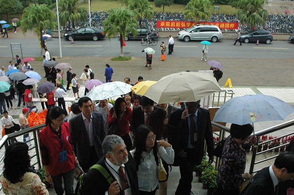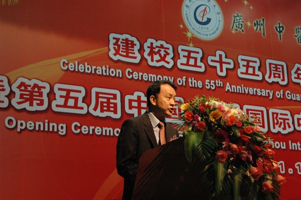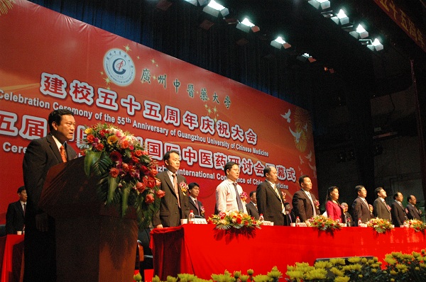 上午9时,"beat365中文官方网站建校五十五周年庆祝大会暨第五届中国广州国际中医药研讨会开幕式"在大会堂隆重举行。广东省政协副主席、台盟中央副主席陈蔚文,国家中医药管理局人事教育司副司长洪净,广东省教育厅党组副书记、副厅长魏中林,卫生厅党组书记陈元胜等领导,全体现任校领导,退休老领导,历届校友代表及在校师生代表2000余人出席大会。
