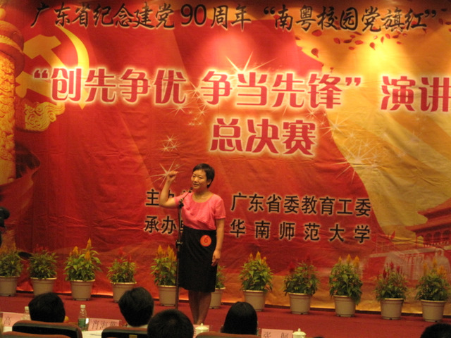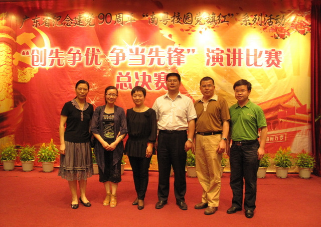 5月31日晚,由广东省委教育工委主办的广东省纪念建党90周年"南粤校园党旗红"系列活动之"创先争优,争当先锋"演讲总决赛在华南师范大学落下帷幕。beat365护理学院杨筱多老师获得了教工组二等奖,人文社科学院李许同学获得学生组优秀奖。