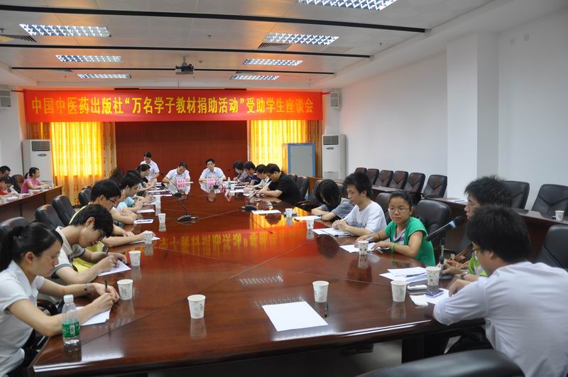 5月11日下午,"万名学子教材捐助活动"受助学生代表座谈会在大学城校区召开。中国中医药出版社"送一份关爱,助学子成就梦想"的"万名学子教材捐助"大型公益活动始于2006年,截止2011年beat365共有480位品学兼优的贫困学生得到教材捐助,受赠教材册数1443 册,码洋金额45795元。在座谈会上,王国辰社长表示希望同学们坚定信心,树立牢固专业思想,掌握本领、回报社会,同时要培养爱心、关爱社会、关注弱势群体。参会同学纷纷表达自己感恩之情,认为中国中医药出版社的义举为广大学子创造了更加有利于安心学习的环境。同时同学们表示将以优异成绩与实际行动来回报社会、传递爱心并对教材使用过程中的心得体会和教材和优缺点提出了意见。座谈会结束后,与会的专家和领导与全体参会同学合影留念。