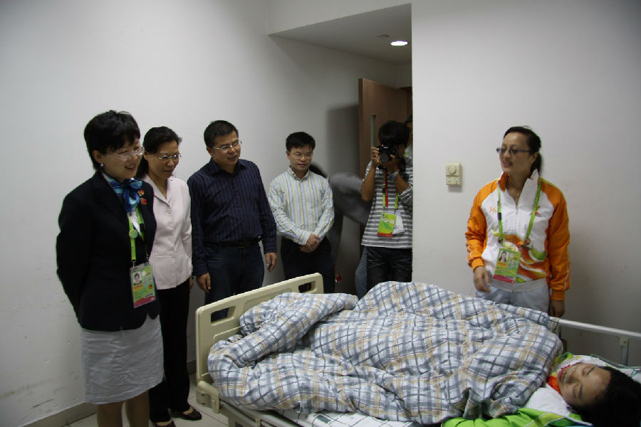 张利娟同学当日上午在铁人三项场馆服务过程中坚守岗位,不幸被疾驰而来的轮滑自行车撞到,所幸伤势并不严重,经医院检查处理后目前已无大碍。下午3点左右,童慧副部长在铁人三项场馆有关领导的陪同下,来到大学城医院急诊科观察室,与护理学院党政领导谭少明、李伊为、陈霖等一起看望张利娟同学。童副部长关切地询问了受伤的过程以及伤势等情况,代表亚组委志愿者部表示衷心的感谢和亲切的慰问,赞扬和感谢其充分发挥"奉献、友爱、互助、进步"的志愿服务精神,为亚运会志愿者服务工作做出了不懈努力,并勉励她安心养伤,争取早日康复。