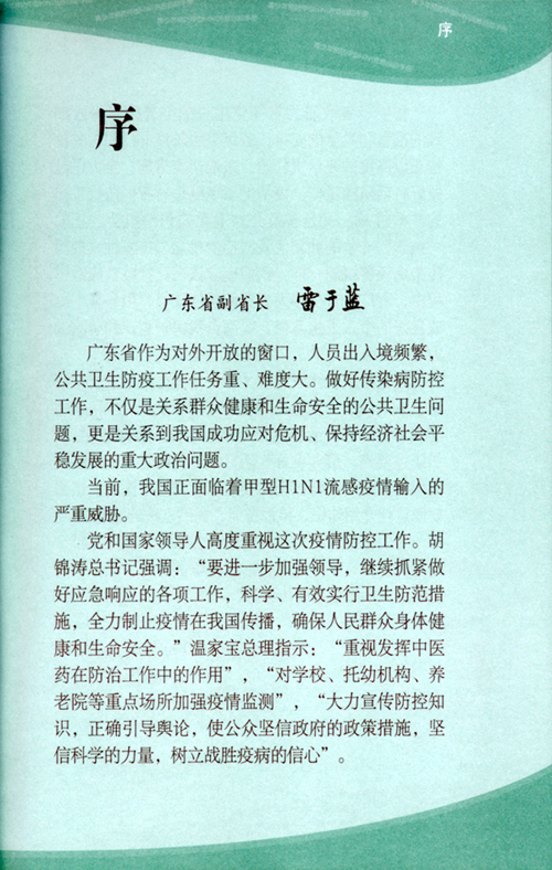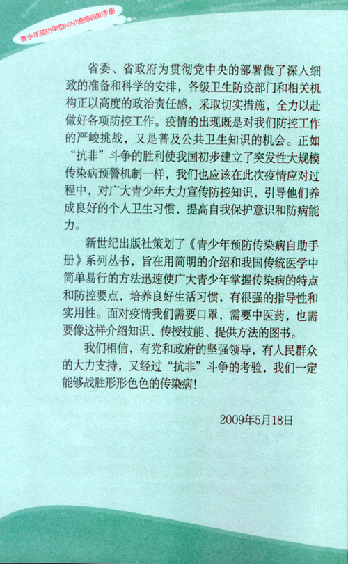 自从甲型HlN1流感疫情今年在全球出现以来,我国吸取"抗非斗争"经验,各级领导对此高度重视,温家宝总理特别指示:"重视发挥中医药在防治工作中的作用","对学校、托幼机构、养老院等重点场所加强疫情监测"。贵院温病学专家钟嘉熙教授最早向社会公布了抗击甲型HlN1流感的中医药方,引起了我们的关注。新世纪出版社是广东省唯一的专业青少年读物出版社,对此疫情深感责无旁贷,于是我们特别约请钟嘉熙教授针对易感染人群编写一本《青少年预防甲型H1Nl流感自助手册》,得到了钟嘉熙教授的大力支持与配合。由于时间紧迫,钟教授立即组织人力,奋战三天三夜脱稿,使该书在第一时间得以面世,为抗击甲型HlN1流感立了一功,雷于蓝副省长欣然为该书作序。