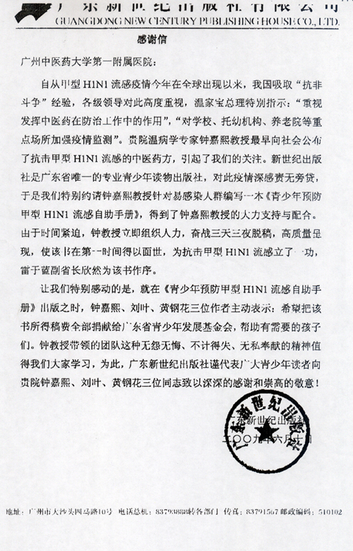 近日,流感病例在我国陆续出现,但疫情已无往年SARS那般凶猛,那般措手不及,因为我国预防措施已及时做好准备,牢牢控制疫情的扩散。在这抗流感的洪流中,我院温病学家钟嘉熙教授、黄钢花副教授、刘叶医师等三位医生也默默地出一份力,针对易感染人群及时编写了一本《青少年预防甲型H1N1流感自助手册》。对此,广东新世纪出版社给一附院发来一封感谢信。