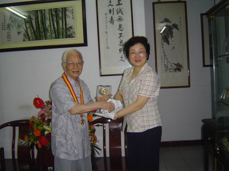彭炜局长也对邓老入选首届"国医大师"表示祝贺,同时祝贺邓老入选国家级非物质文化遗产项目(中医诊法)代表性传承人,感谢邓老多年来对中医事业的贡献,嘱咐邓老保重身体。吴刚、彭炜一起为邓老授予国家级非物质文化遗产项目(中医诊法)代表性传承人勋章、奖座。