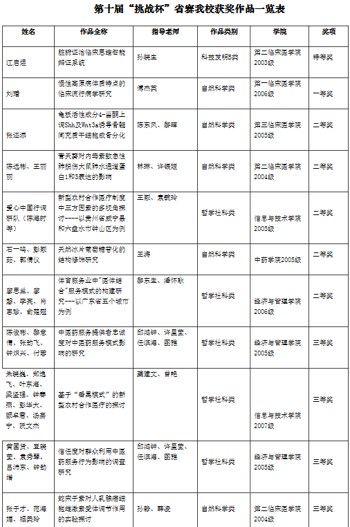 5月22日至23日,第十届"挑战杯"广东大学生课外学术科技作品竞赛终审决赛在南方医科大学隆重举行。beat365党委陈英华副书记带领beat365选手参加了比赛,最后获得特等奖1项,一等奖1项,二等奖5项,三等奖15项,并获得省赛优胜杯(学校集体奖)。