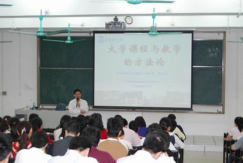 本次培训班邀请数位校内外具有丰富教学经验的资深教师,从教学方法、教学技能、讲课技巧等各个教学环节对青年教师开展培训。4月12日培训班由华南师范大学课程与教学系主任、博士导师黄甫全教授,华中师大心理学院博士后、广州大学教育学院心理系陈少华教授分别就《大学课程和教学的方法论》和《高校课堂教学和管理》作了精彩的讲座。