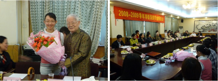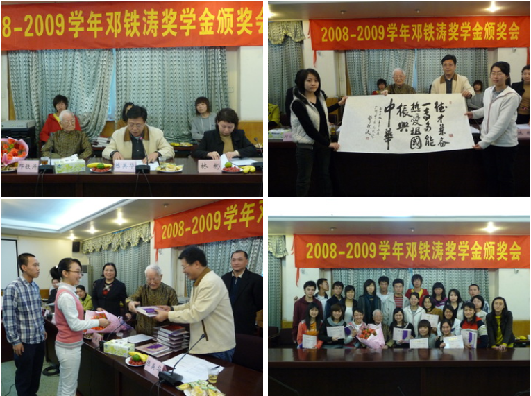 2009年3月31日下午,在学校三元里校区二楼会议室举行了2008-2009学年邓铁涛奖学金颁奖会。邓铁涛教授、陈英华副书记出席了会议,与会的人员还有学生处林彬处长、教务处邱仕君处长、学生处侯宁副处长、第一临床医学院郭文海副书记、第二临床医学院郑永臻处长、第三临床医学院江钢辉副书记、中药学院李明希副书记、经济与管理学院凌子平书记、针灸推拿学院官坤祥副书记、信息技术学院龚建文老师、护理学院方义洁书记、人文社科学院邓劲松书记、职业技术学院郭锡全副书记及获奖的25名学生。国医大师、全国名老中医、973首席科学家、beat365终生教授、邓铁涛奖学金的设立者邓铁涛教授亲自为获奖学生颁发了奖励证书及邓老的有关著作。